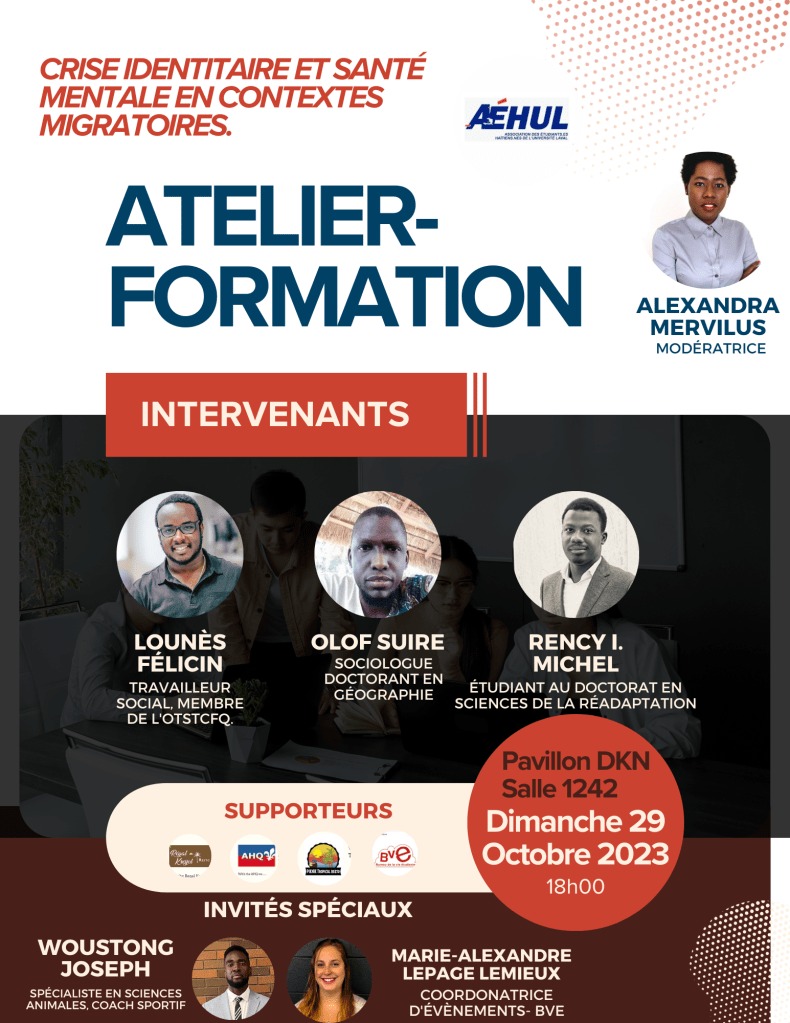 Conscient des difficultés auxquelles font face les migrants particulièrement les étudiants internationaux, le comité de l’Association des Étudiants Haïtiens de l’Université Laval (AÉHUL) organise le dimanche 29 octobre 2023, un atelier-formation sur le sujet *Crise identitaire et santé mentale en contextes migratoires.*