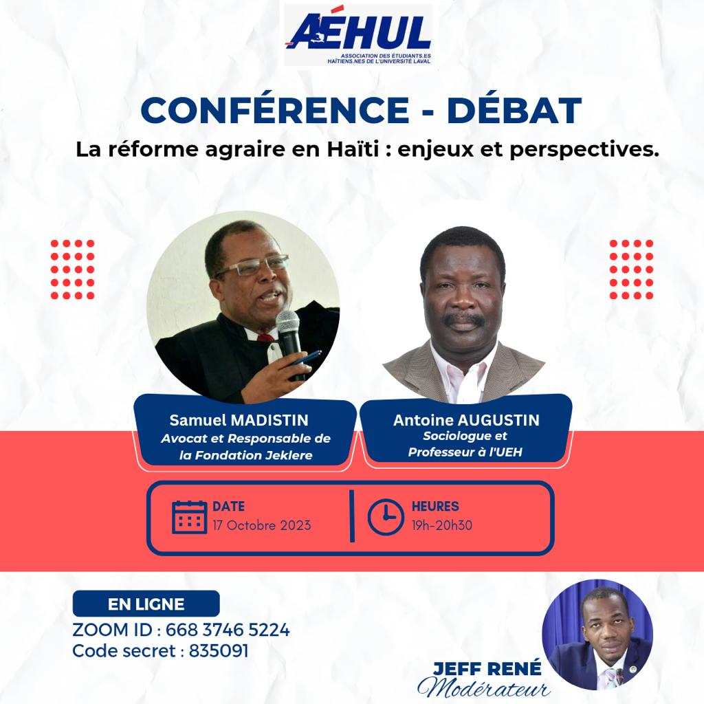 Dans le but de commémorer la mort du premier empereur haïtien, Jean-Jacques Dessalines, l’Association des Étudiants.es Haïtien.nes de l’Université Laval ( AÉHUL) organise une conférence-débat autour du thème » La réforme agraire en Haïti : enjeux et perspectives ».
